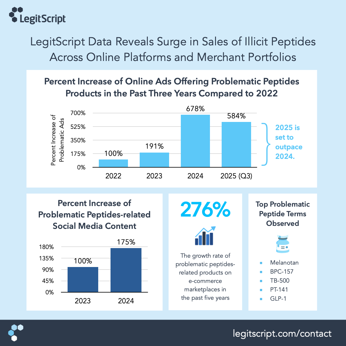 - Significant Growth in Online Advertising: In 2024, LegitScript observed 308% more ads related to problematic peptides than in 2023, and 678% more compared to 2022. And 2025 is set to surpass 2024.