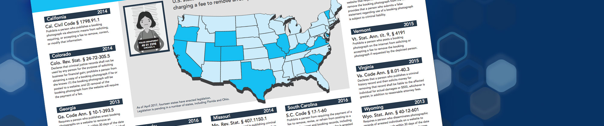This handy infographic provides information on the 14 US states that have enacted legislation prohibiting merchants from charging a fee to remove arrest photos (mugshots) from websites.