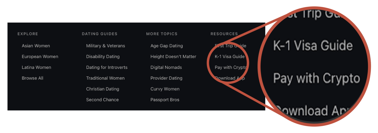 とある最近のケースでは、図に示す出会い系サイトを、適切なMCC 7273を設定していないとしてVIRPガイドライン違反として特定・報告しました。精査の結果、Apple App Storeにおける消費者からの低評価レビューや詐欺疑惑のパターンなど、さらなる兆候も判明しています。加えて、当該加盟店は暗号資産(仮想通貨)決済の導入やビザ申請サービスの提供を行っていますが、これらはいずれも詐欺や不正のリスクを高める要因となります。