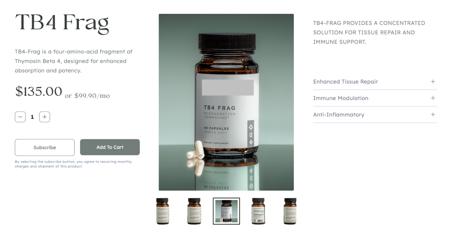 これらのサプリメントは、消費者にとってペプチドを摂取する手軽な手段となっています。また加盟店にとっては、「高い効果がある」という隠れ蓑を利用することで、高い集客力と収益性を維持することを可能にしています。一部のサプリメント成分には確かに健康上の利点があるかもしれませんが、多くは根拠のない主張とともに販売されており、それらは有名人やソーシャルメディアのインフルエンサーによって大々的に宣伝されることも少なくありません。こうした製品の中には、BPC-157 やサイモシンベータ4 といったペプチドが含まれています。これらはいずれも FDAの「危険物質リスト」に掲載されていますが、最近ではサプリメントの形態で加盟店のポートフォリオに登場しています。