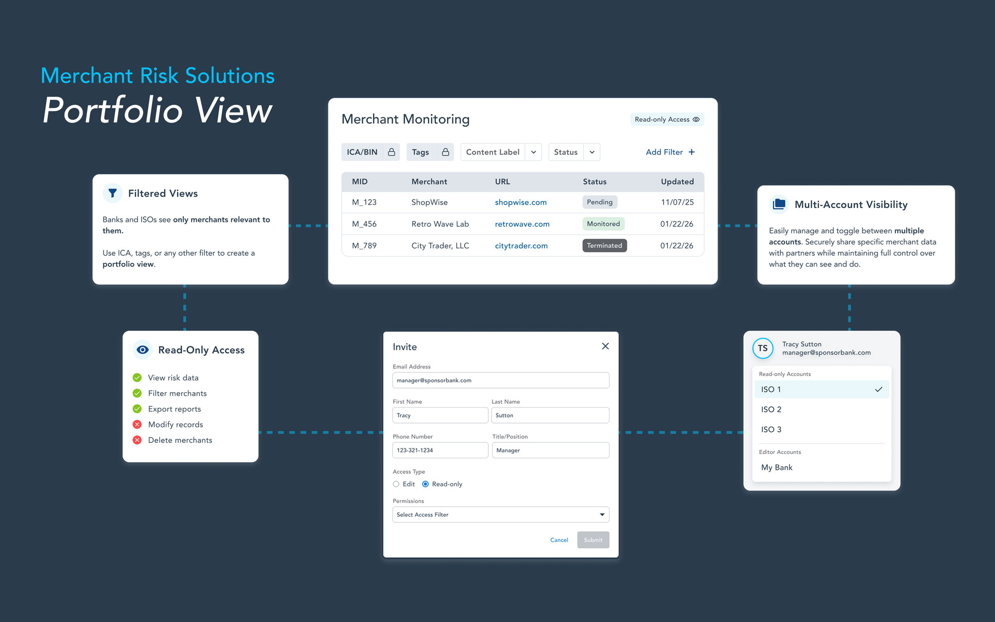 - Standardize downstream risk visibility across all ISO and payfac relationships with a single, independent view